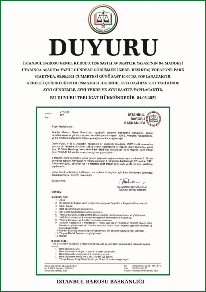 İstanbul Barosu Başkanlığının duyurusuna göre, genel kurul Beşiktaş Vodafone Park Stadında 5 Haziran 2021 saat 10.00’da toplanacak. Gerekli çoğunluğun sağlanmaması halinde genel kurul 12 – 13 Haziran 2021 tarihinde, aynı saat ve aynı yerde yapılacak.