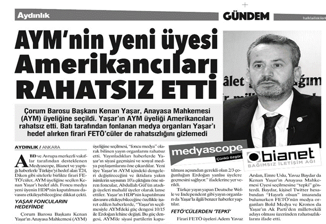 ABD ve Avrupa merkezli vakıflar tarafından desteklenen Medyascope, Bianet ve yaptığı haberlerle Türkiye’yi hedef alan T24, Diken gibi sitelerle birlikte firari FETÖ’cüler, AYM üyeliğine seçilen Kenan Yaşar’ı hedef aldı. Foncu medya yeni üyenin HDP’nin kapatılması davasını etkileyebileceğine dikkat çekti.
